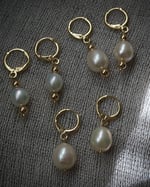 The 12mm 14ct gold filled Huggie earrings with 7.5mm x 8.5mm (approximately) Freshwater Pearls are hinged providing a quick and easy way of putting them in a pierced ear. To put on the earrings, hold each side, pull open the ends, then put the finer end in the ear and push the ends back together again.